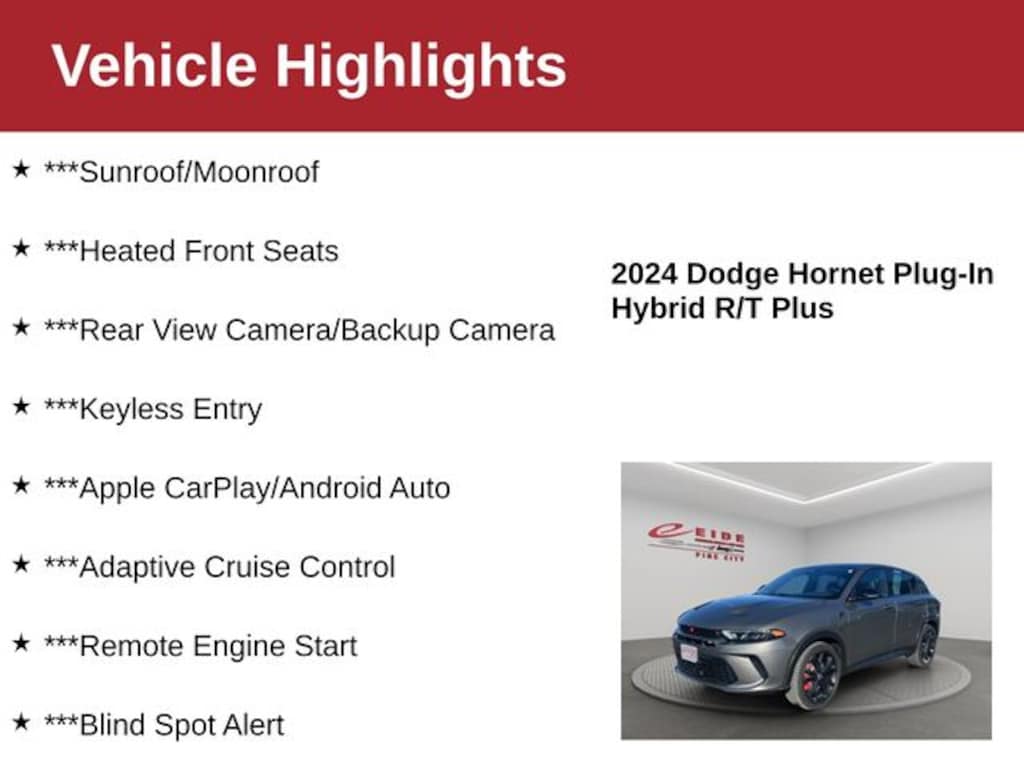 Meet the 2024 Dodge Hornet R/T Plus AWD in Gray Cray, the sharp-looking performance crossover that brings serious attitude and modern tech together. Powered by a responsive 1.3L turbo hybrid powertrain with confident all-wheel drive, this Hornet delivers quick acceleration and an engaging drive.