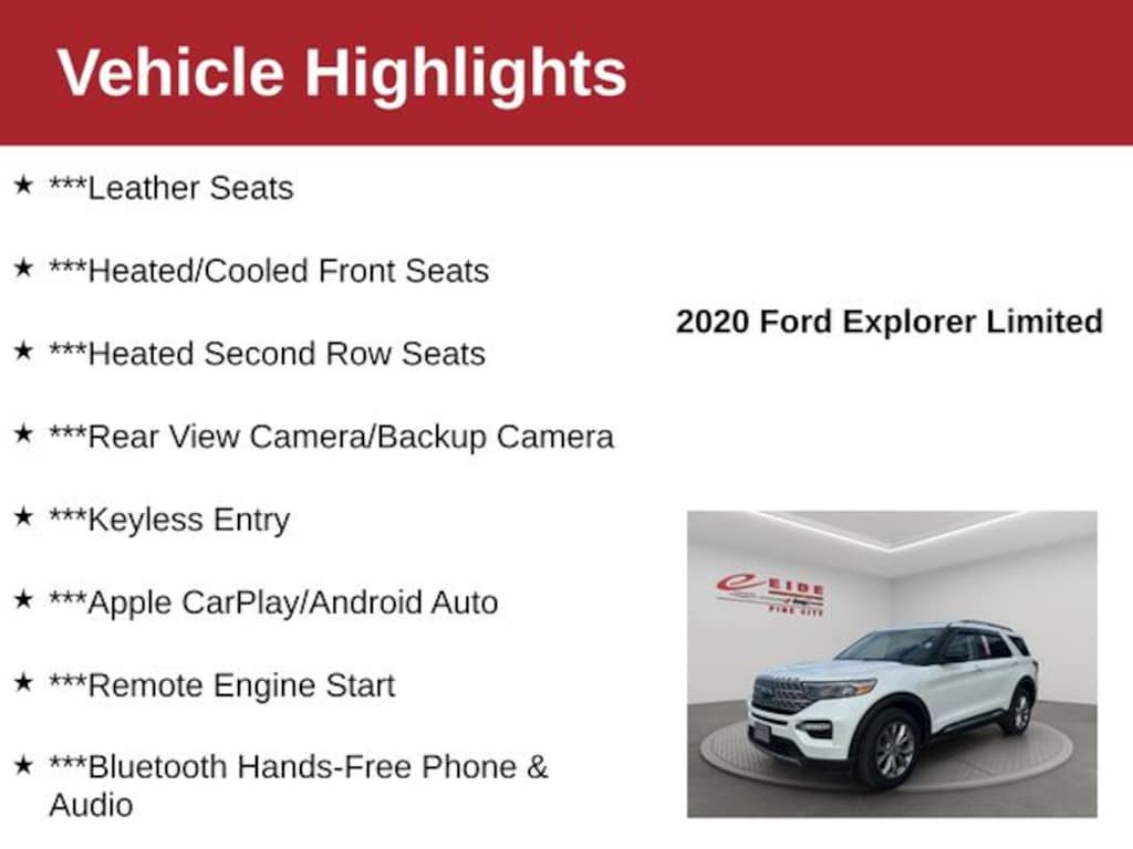 Discover the perfect blend of power, style, and versatility in this stunning 2020 Ford Explorer Limited. With its sleek white exterior and premium interior features, this SUV is ready to elevate your driving experience.