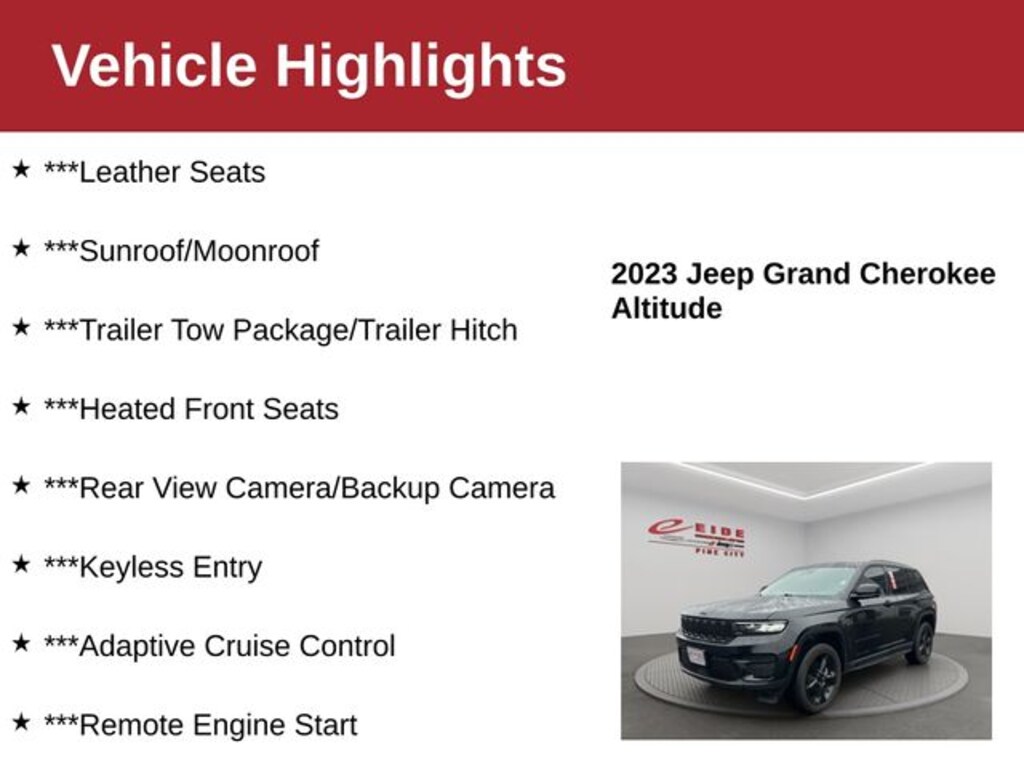 Meet the 2023 Jeep Grand Cherokee Altitude 4WD in Diamond Black Crystal Pearlcoat, the sleek and sophisticated SUV that perfectly balances luxury, technology, and capability. Powered by a smooth 3.6L V6 engine and confident 4WD, this Grand Cherokee is ready for everything from daily commutes to weekend getaways. Inside you will find premium leather seats, heated front seats, a heated steering wheel, dual-zone automatic climate control, and Uconnect 5 on an 8.4-inch touchscreen with Bluetooth hands-free phone and audio. A power sunroof floods the cabin with light, while convenience features include keyless entry and start, remote engine start, adaptive cruise control, lane departure warning, backup camera, power liftgate, and rain-sensing windshield wipers. The trailer tow package makes light towing effortless, and the bold 20-inch gloss black aluminum wheels give it a sharp, modern stance. This one-owner vehicle with an accident-free Auto Check is a standout. Call today and drive it home!