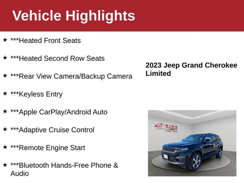 Meet the 2023 Jeep Grand Cherokee Limited 4WD in Diamond Black Crystal Pearlcoat, the refined and capable SUV that delivers premium comfort with genuine Jeep capability. Powered by a smooth 3.6L V6 engine and confident 4WD, this Grand Cherokee is perfect for daily drives, family hauls, or weekend escapes.