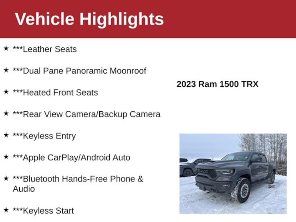 ***TRX Level 1 Equipment Group***Rain Sensitive Windshield Wipers***Auto High-beam Headlights***Dual Pane Panoramic Moonroof***Adaptive Suspension***Backup Camera***Uconnect 5 Nav w/12.0" Display***Apple CarPlay/Android Auto***Bluetooth Hands-Free***Keyless Entry & Start***Cruise Control***Leather Seats***Heated Front Seats***Heated Steering Wheel***A/C w/Dual-Zone Auto Temp control***Accident Free Auto Check***18" Black Paint/Polish Aluminum***