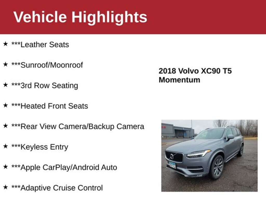 Discover the luxurious 2018 Volvo XC90 T5 Momentum in sophisticated Osmium Gray Metallic, a local trade-in that's accident free with spotless Auto Check history. Powered by the efficient 2.0L I4 turbocharged engine and confident AWD, this three-row SUV delivers smooth performance with safety and comfort. Sink into leather seats with heated front seats while the power sunroof floods the cabin with light and dual zone automatic temperature control keeps everyone happy. Tech and safety impress with Apple CarPlay and Android Auto, adaptive cruise control, backup camera, auto high beam headlights, rain sensitive wipers, and keyless entry and start. Convenience shines with a power liftgate and sharp 18 inch 5 spoke alloy wheels in sparkling silver. This loaded XC90 is family luxury at its finest and vanishing fast! Call now to schedule your test drive and drive home in style today.